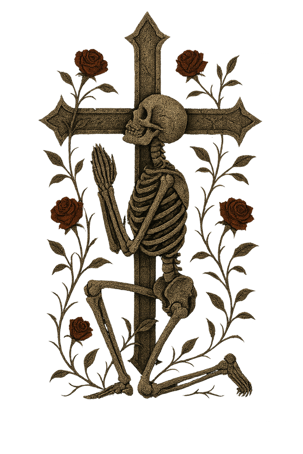 Kneeling before the cross in eternal prayer, this skeletal soul clings to reverence beyond the grave. Twined with roses, it’s a tribute to death, devotion, and the bloom of belief.