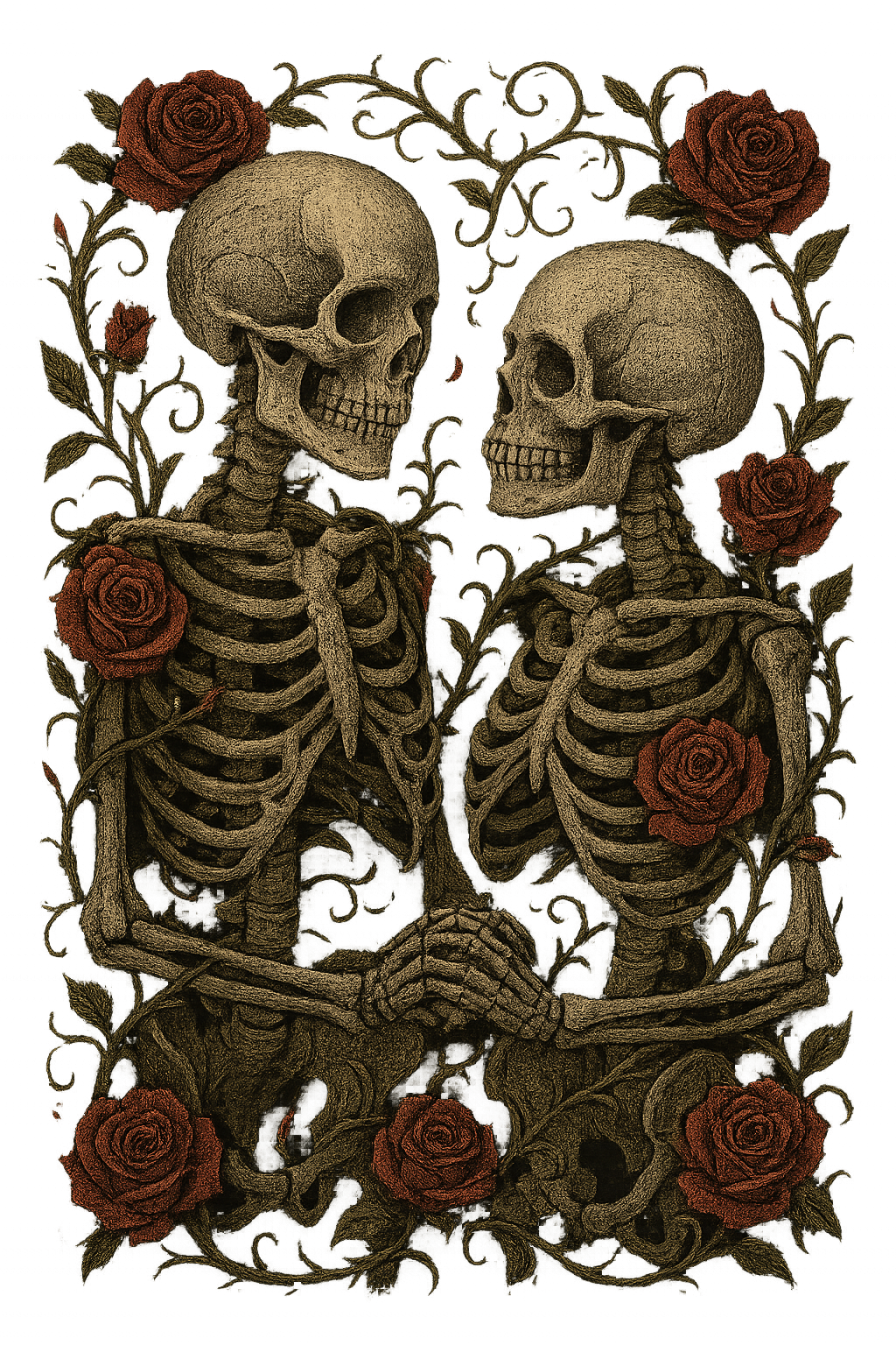 Two skeletons wrapped in each other’s arms, encircled by blooming roses — a tender reminder that true love doesn’t rot, it rests.